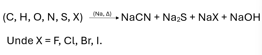 În urma reacției cu sodiu, azotul, sulful și halogenii din substanța organică analizată se transformă în : cianură de sodiu, sulfură de sodiu sau halogenuri de sodiu.